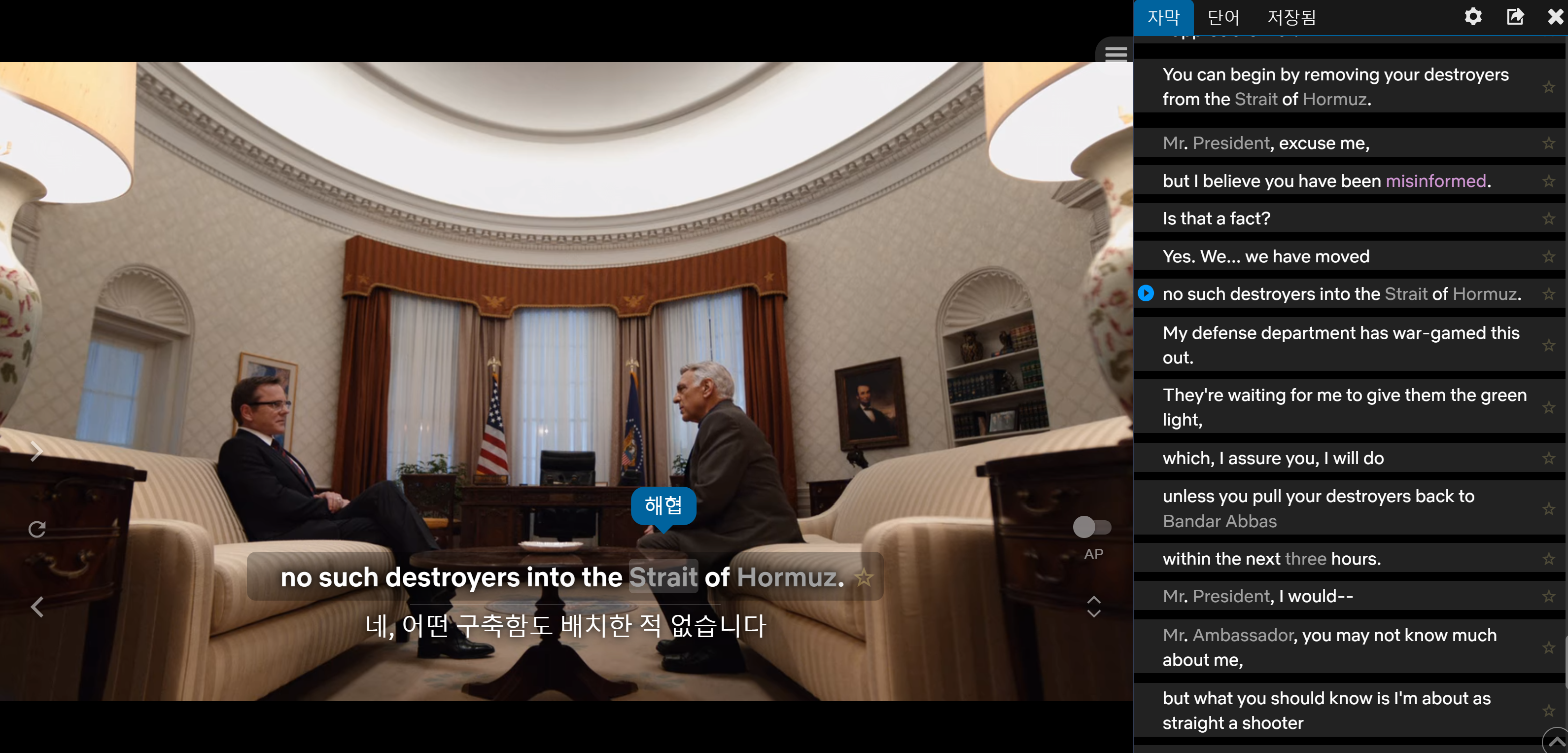 자막 두 개를 동시에 켜놓고 보실 수 있습니다.